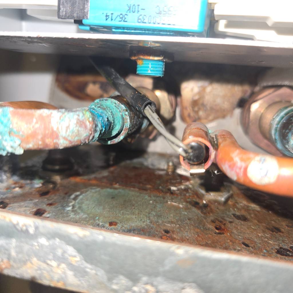 Le client constatait une fuite importante au niveau du groupe de sécurité et de la cuve. Après expertise, nous avons découvert que le doigt de gant (la pièce où passent les tuyaux frigorifiques) a été littéralement percé par la corrosion.