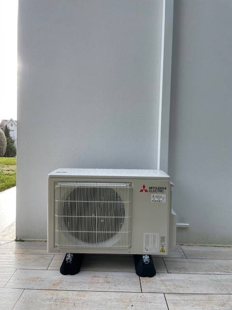 Le groupe extérieur Mitsubishi Electric est installé sur des supports de sol antivibratiles (big foots). Ces plots robustes absorbent les vibrations du compresseur, protégeant ainsi le revêtement de votre terrasse et assurant la tranquillité du voisinage.