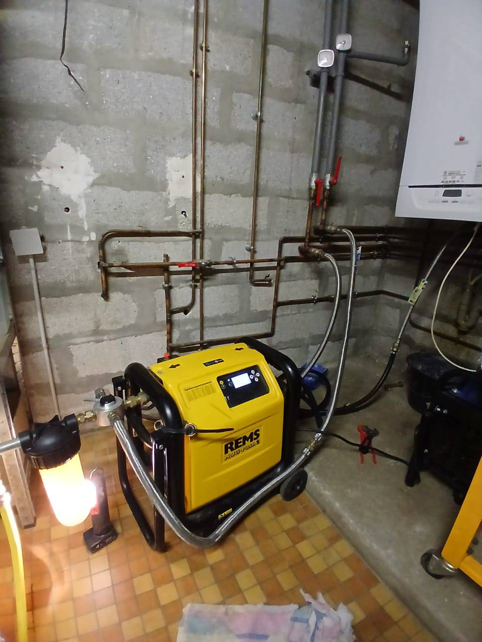 L'intervention est réalisée avec une centrale de désembouage REMS Multi-Push S.