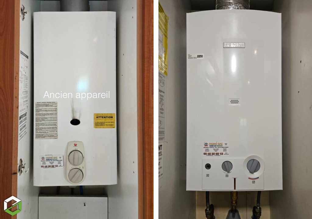 - Ancienne installation : Chauffe-eau gaz Saunier Duval (génération ancienne, visible sur les photos avec trace d'usure sur la façade).